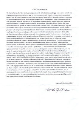 Manuela racconta di aver sofferto moto negli ultimi mesi, a causa di una malattia e dei continui dolori che la sua esistenza ha dovuto sopportare, e che solo la fede e la speranza le hanno permesso di superare. Manuela racconta anche la storia di Franco, il quale è troppo commosso per poter prendere la parola. Egli, feritosi gravemente mentre era sul luogo di lavoro, dopo essere stato ricoverato in ospedale d’urgenza ed essere stato dichiarato ‘deceduto’ dai referti medici, si è salvato, grazie alle preghiere che i suoi amici e familiari hanno rivolto all’Arcangelo.